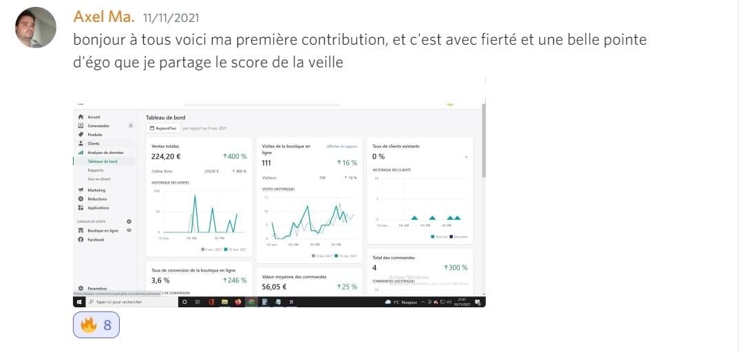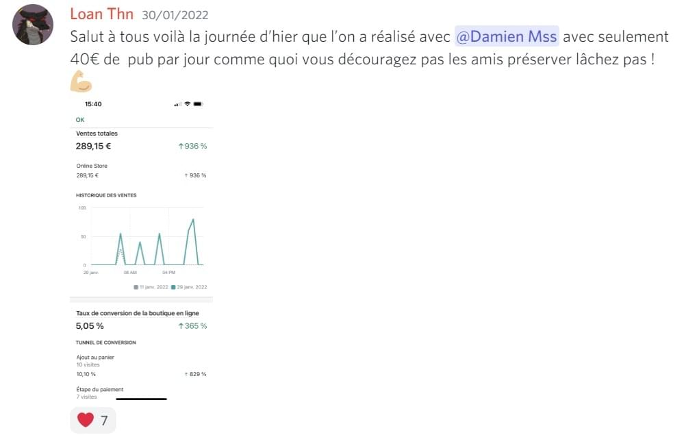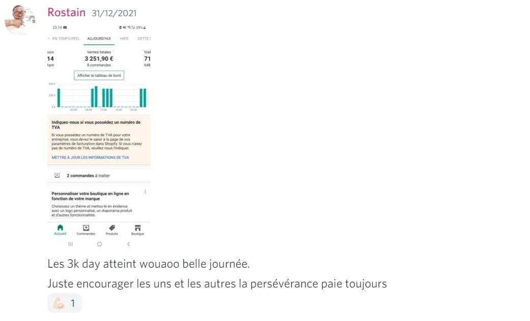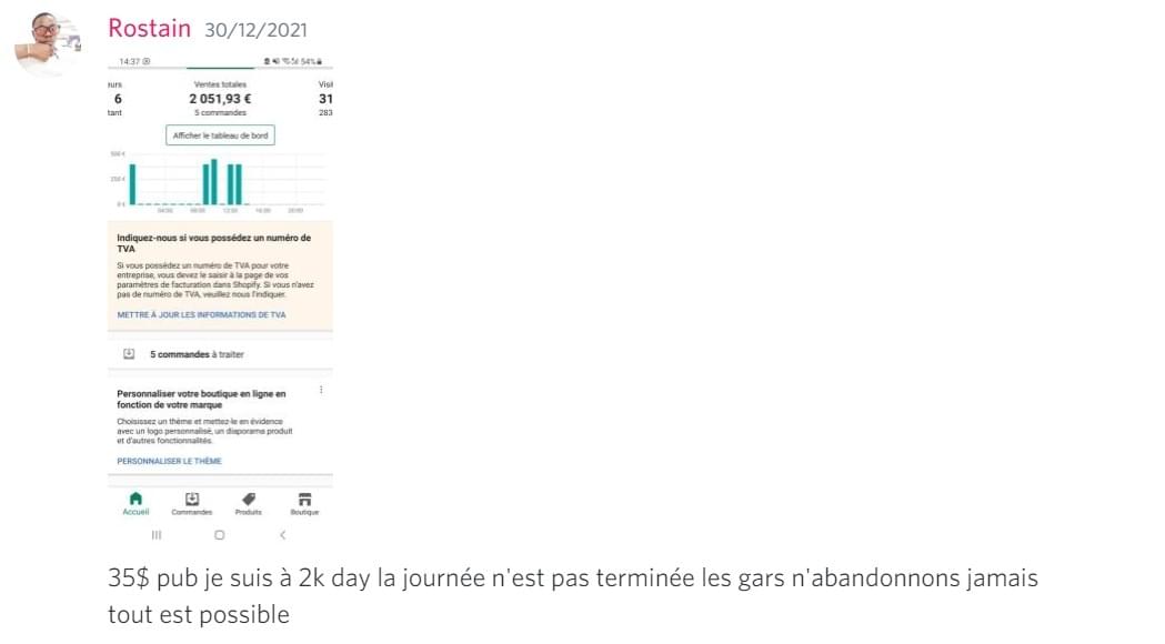 Ilyesse a pu généré ses premières ventes sur sa boutique lors de ses premiers jours de testing en applicant pas à pas les étapes de programme d'accompagnement