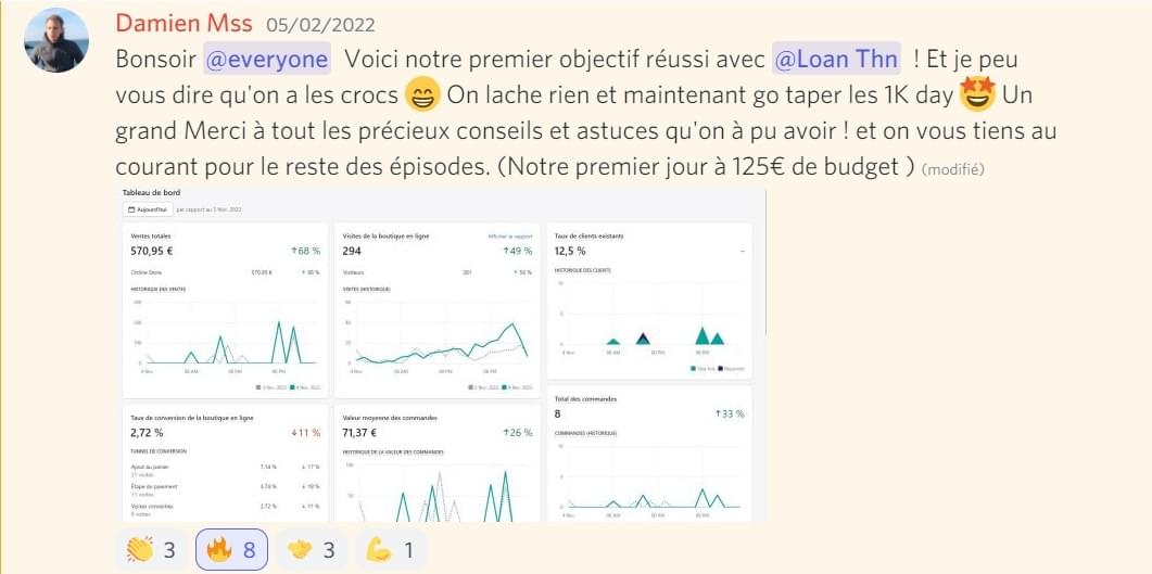 Damien n'avait aucune expérience en e-commerce avant de rejoindre notre programme d'accompagnement. En 1 mois, il a généré 1K de CA en appliquant la méthode à son rythme en parallèle de son travail de mécanicien industriel.